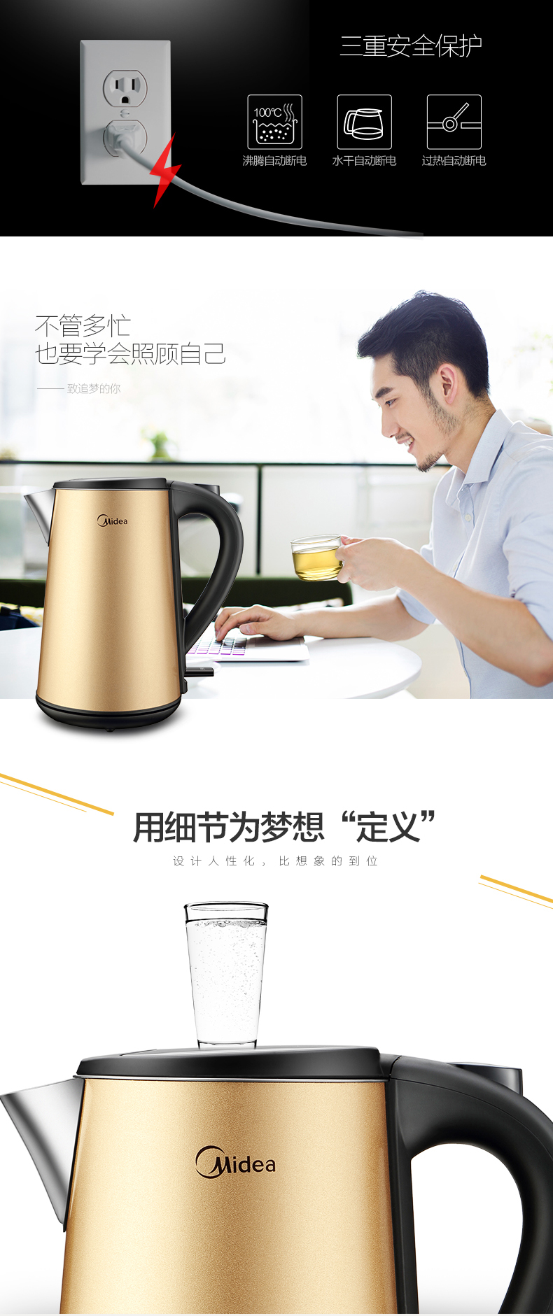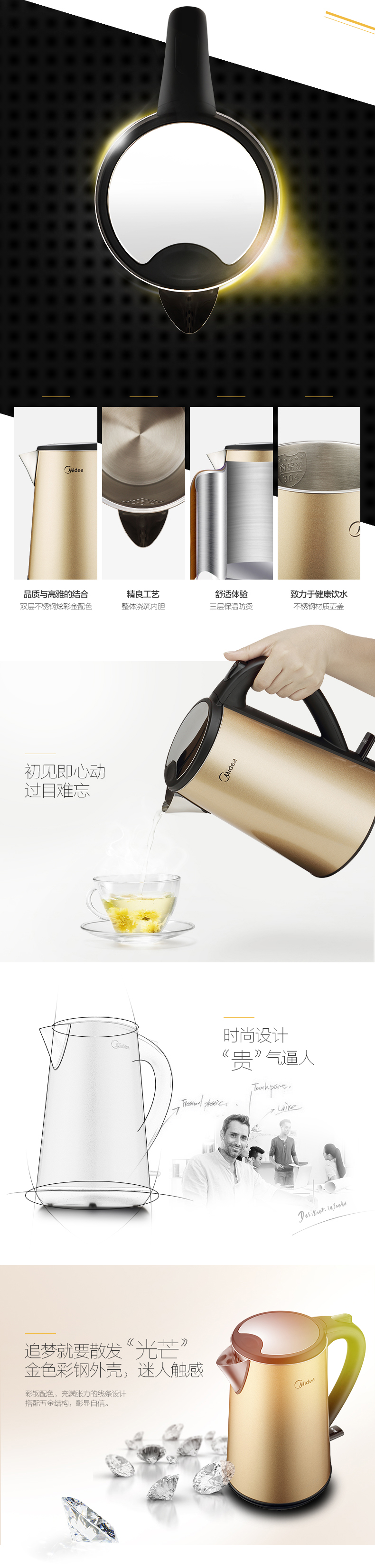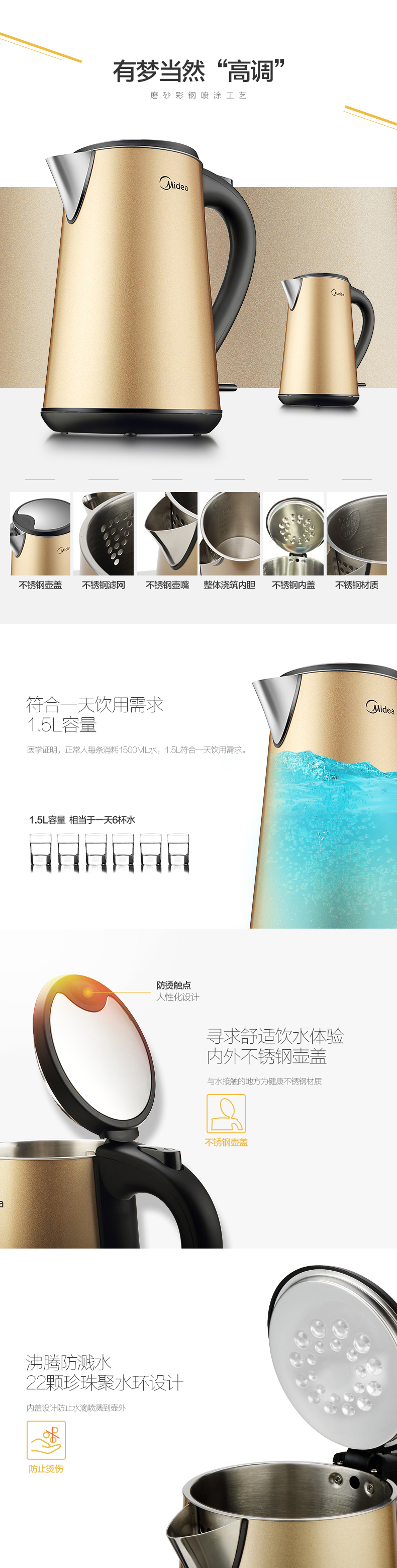 三層彩鋼防燙;6D全鋼(壺身、壺頂蓋、壺嘴、壺內(nèi)膽、過濾網(wǎng)、壺內(nèi)蓋);strix進(jìn)口溫控器,高效控溫;無縫內(nèi)膽,更易清潔;流行土豪金配色