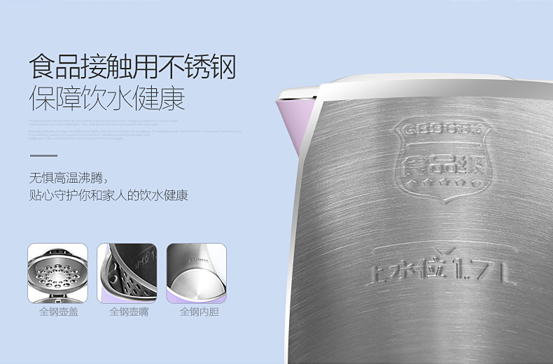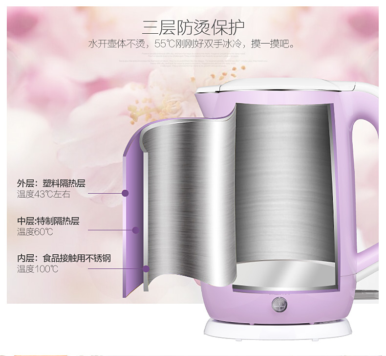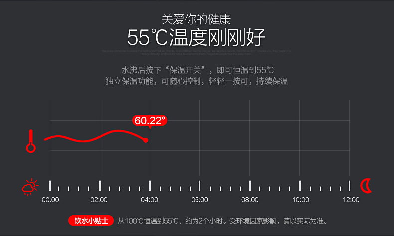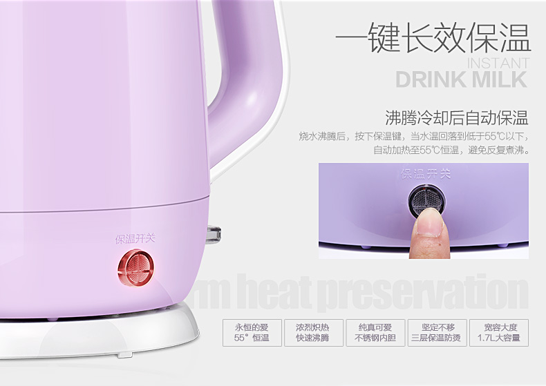 55°低功率PTC保溫(50W) ;STRIX溫控器;雙層防燙壺身結(jié)構(gòu);金屬防塵蓋