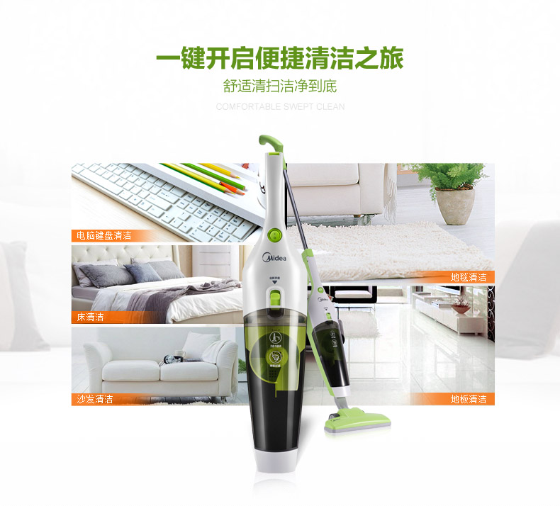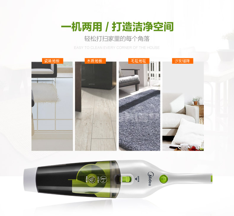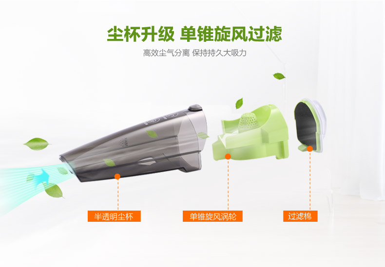 高效電機;二合一設計,輕便易用;單錐塵杯設計,高效分離,小巧精致;多刷頭配置,清掃不留死角;