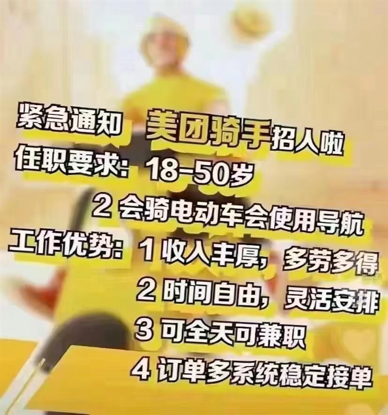 入職要求:18-55周歲會(huì)騎電動(dòng)車會(huì)看導(dǎo)航?jīng)]有案底即可入職