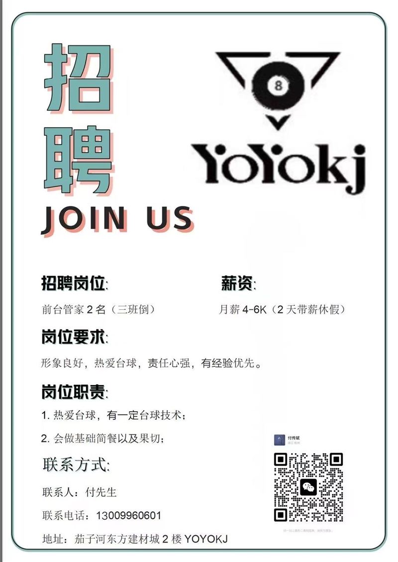 Yoyo臺球招聘擺球員兼助教